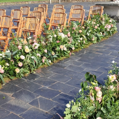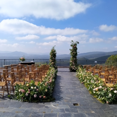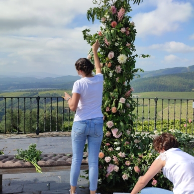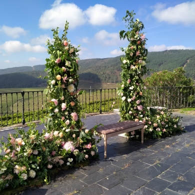 Eli nos pidió dos columnas tipo tótem en el altar con mucha personalidad pero románticas, y un pasillo a juego que le marcase el camino como si fuese un jardín lleno de flores, que tanto a ella como a su familia le encantan.